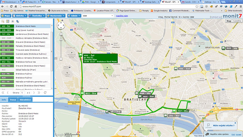 Na mape vidíte prehľad kde sa Vaše vozidlá nachádzajú, kto je šofér, akou idú rýchlosťou alebo trasu za poslednú hodinu.